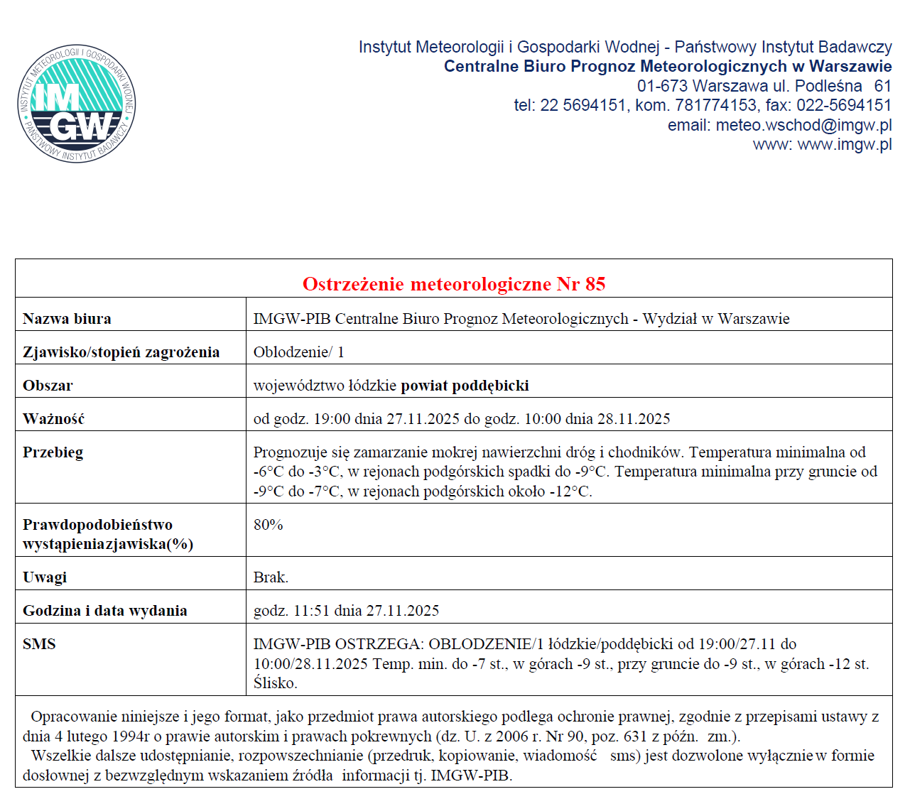 Ostrzeżenie meteorologiczne - oblodzenie