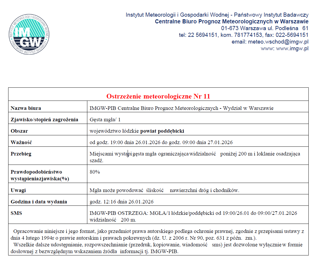 Ostrzeżenie meteorologiczne - gęsta mgła